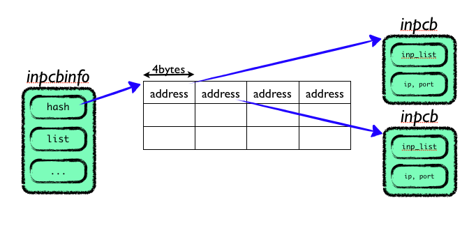 처음에 언급한 심볼인 '_tcbinfo','_udbinfo'는 실제로 inpcbinfo구조체로 되어 있으며, 해당 구조체 중 첫 번째 4바이트 포인터가 해시테이블을 가리키고 있습니다. 그리고 구조체의 8바이트 뒤에 위치한 hashmask가 해시 테이블의 갯수를 나타냅니다. 해시 테이블을 기본적으로 4바이트 크기를 가지고 있습니다.