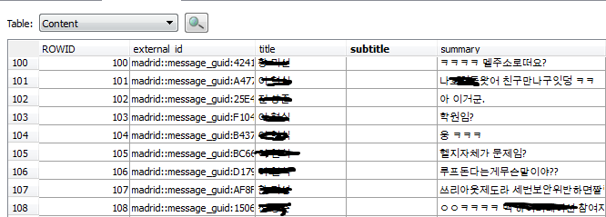 SMSSearchdb.sqlitedb 파일을 뷰어로 확인하면 다음과 같이 나타난다.